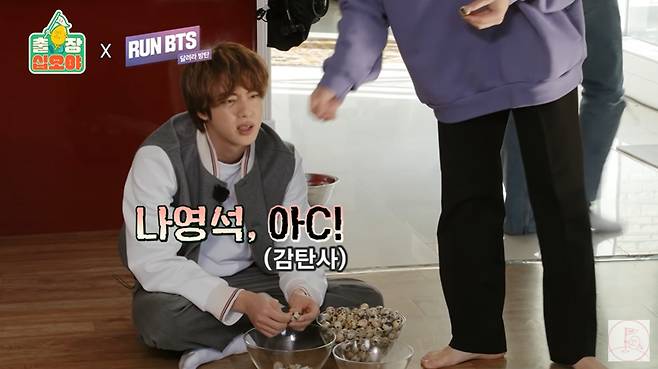 이후 진이 메추리알 껍질을 까다 "나영석, 아C(아씨)"라고 말하고, 이를 지켜보며 환하게 웃는 나영석 PD의 모습이 공개됐다. 손을 마주 잡고 빙글빙글 돌며 해맑게 웃는 제이홉, 뷔의 모습, 복잡한 상황에도 가만히 앉아 명상을 하는 듯한 슈가, 메추리알 까는 데 집중하는 진의 모습도 이어져 본 방송에 대한 기대를 더했다.