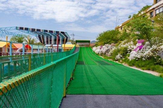 강화도 무지개글램핑은 2020년에 오픈한 신축 캠핑장으로 특히 아이를 동반한 가족 여행객에게 추천하고 싶어요. 대형 레일 썰매와 트램펄린, 여름에는 수영장도 이용할 수 있답니다.