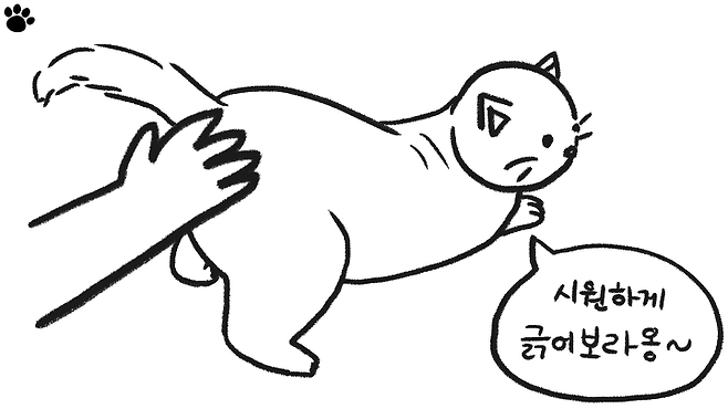 때문에 엉덩이를 들이밀면 긁어준다는 것을 아는 고양이는 집사를 향해 엉덩이를 들이미는 것.