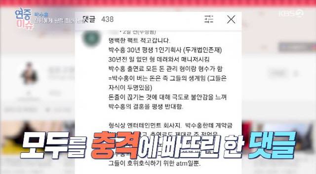 최근 박수홍의 유튜브 채널에 한 네티즌이 박수홍의 형과 형수가 100억 원이 넘는 출연료와 계약금을 횡령했다는 댓글을 게재해 논란이 일었다.