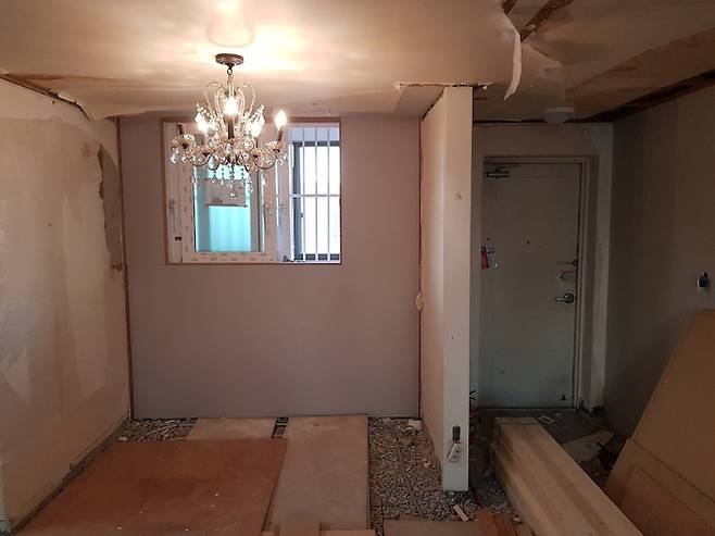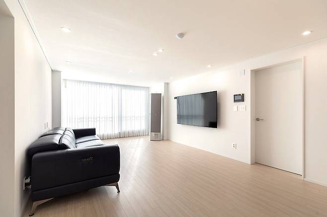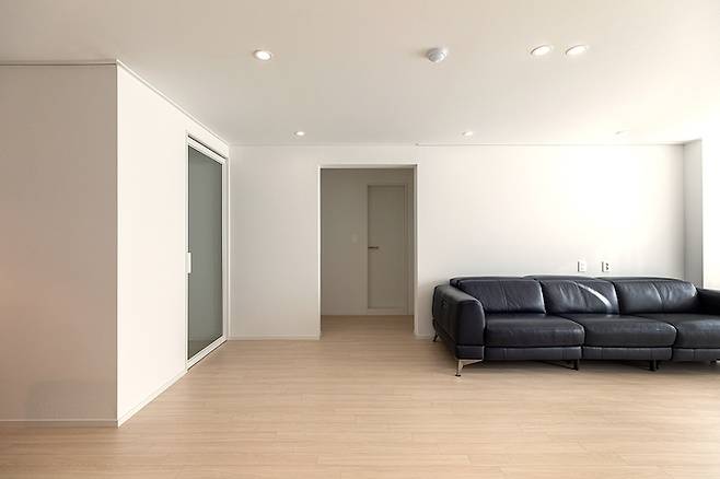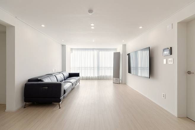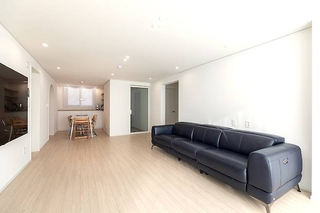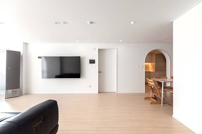거실은 기존에 확장된 형식을 활용하였고, 바닥은 강마루 벽과 천장은 실크벽지로 마감하였습니다. 문선을 20mm로 줄여서 세련되면서도 미니멀하게 표현하였고 걸레받이 높이 40mm, 천장 몰딩도 30mm로 설정하여 공간에 대한 선을 얇고 간결하게 표현하였습니다.