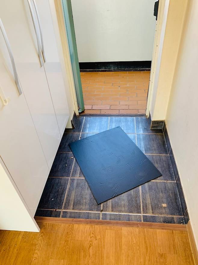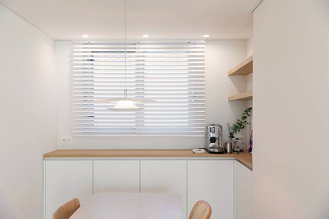 현관 벽면을 연장할 때, 깊은 수납장을 만들기 위해 벽체를 꺾어서 설치하였고 그 이유로 반대쪽에 생긴 구석 공간에는 반장을 ㄱ자로 꺾어서 설치하고 상단에는 선반을 2개 설치하고 반장 상판과 같은 우드필름으로 마감하여 좋아하시는 물건을 올려두실 수 있도록 활용도 높게 설계했습니다.