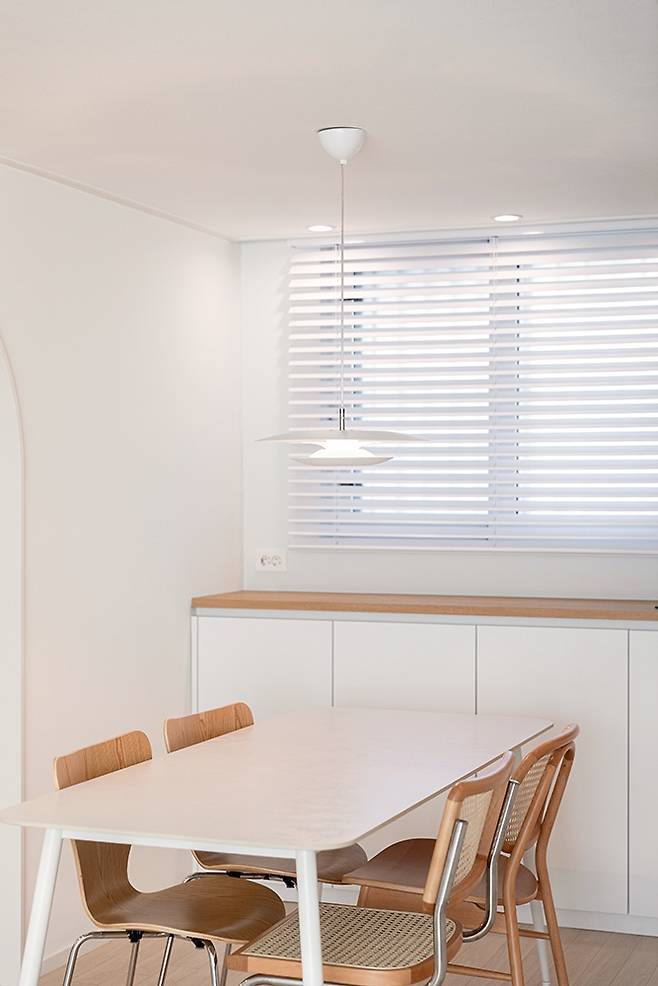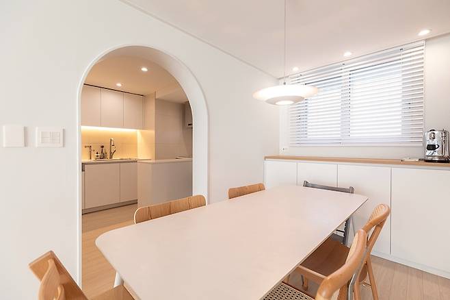 다음은 거실에서 주방으로 들어서기 전 다이닝 공간입니다. 주방 입구를 아치형식으로 디자인하여 곡선의 포근함과 따뜻한 무드를 주었고 식탁 팬던트 조명은 형태가 세련되면서 얇은 라인형태를 띄고있는 조명이 이 집에 잘 어울릴 것 같아 노르딕네스트에서 직구하여 설치하였습니다.
