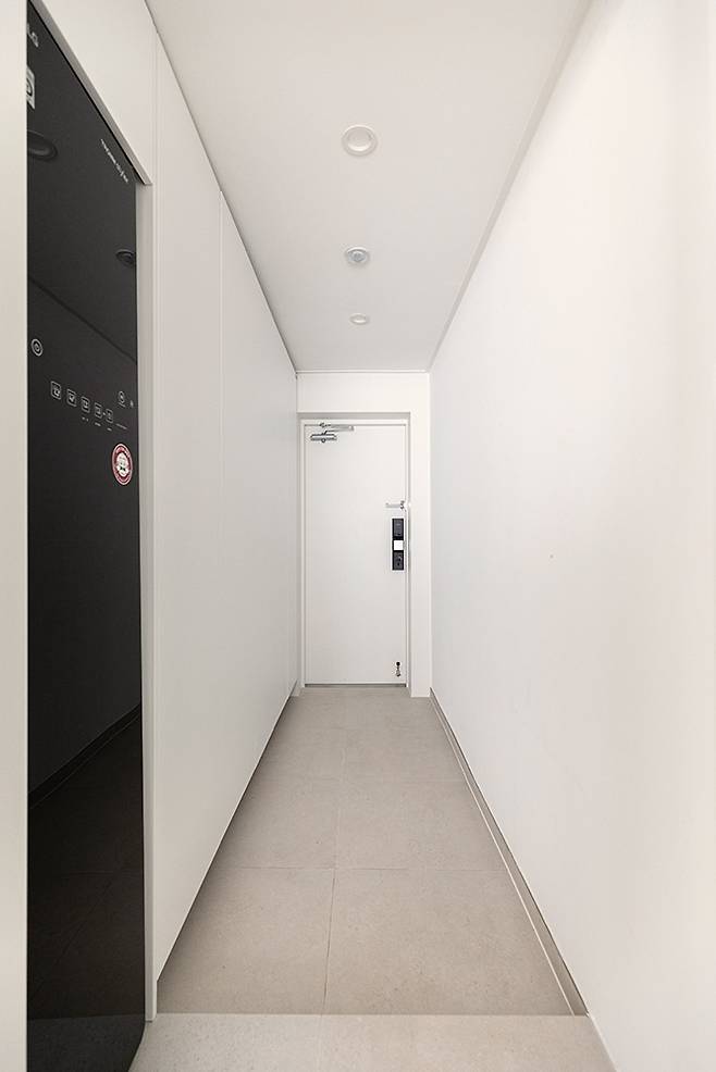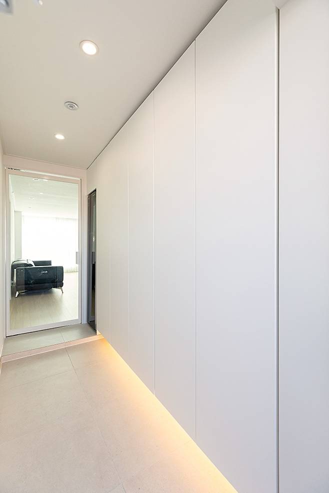 현관문은 흰색으로 필름 처리하여 현관이 더 이상 외부 공간이 아닌, 내부의 디자인과 연결되는 구성이 되도록 마감재를 선정하였습니다^^ 신발장 하단은 밑 띄움을 하여 간접 조명을 설치해 더 밝게 사용하시면서 자주 사용하시는 신발을 편리하게 보관하실 수 있도록 설계하였고, 스타일러장 앞으로 바닥 단 높임을 하여 스타일러를 사용하실 때 외부 신발을 신으셔야 하는 불편함이 없도록 배치하였습니다.