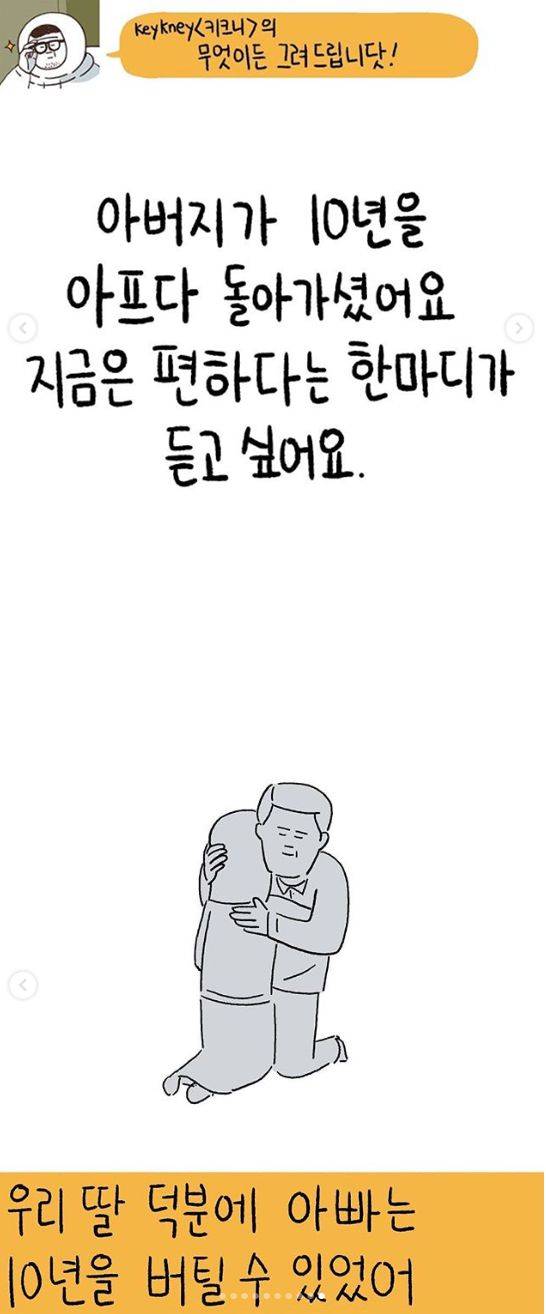 키크니 작가의 또 다른 매력은 바로 따뜻한 감성입니다. 작가는 ‘학업, 취업, 직장생활, 육아 스트레스 관련 댓글이 많다’고 합니다. 어떤 독자는 돌아가신 부모님이나 죽은 반려동물이 하늘에서 무얼 하고 있는지 그려달라고도 한다는데요. 다소 난감할 수도 있는 요청이지만 어떻게 그려낼지 깊게 고민하고 위로가 되기 위해 노력합니다.