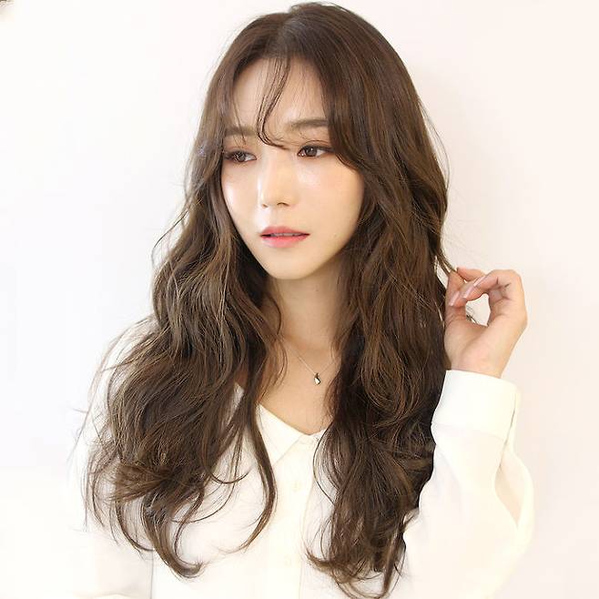 적당한 층에 볼륨 있는 웨이브로 풍성함을 주고, 시스루 컬리뱅으로 생기 있는 여신 스타일