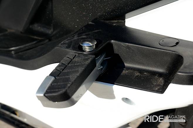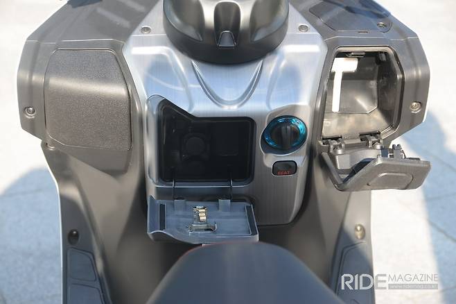이외에 준비된 편의 장비로 프론트 패널 중앙에 위치한 수납공간에 12V 소켓이 구성되어 있어 언제든지 휴대기기 충전이 가능하다. 또 전면 중앙 수납함 하단에 봉투나 가방을 걸어 둘 수 있는 고리가 있어 다양하게 사용이 가능하다. 발판도 넓은 편이라 주행 중 발의 위치를 편하게 이동시킬 수 있다.