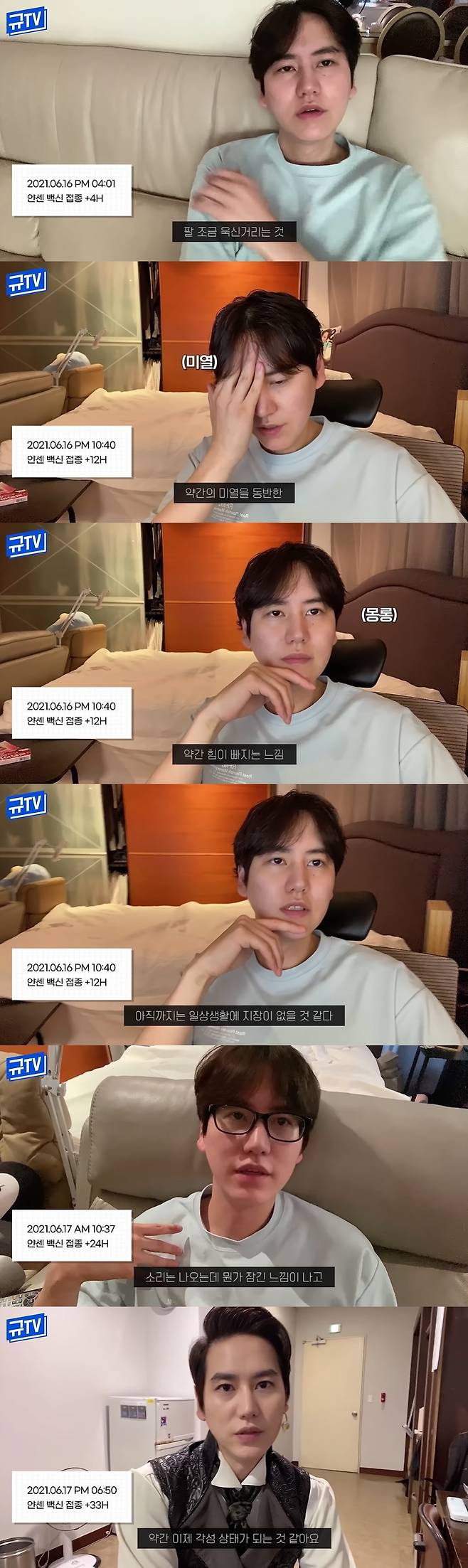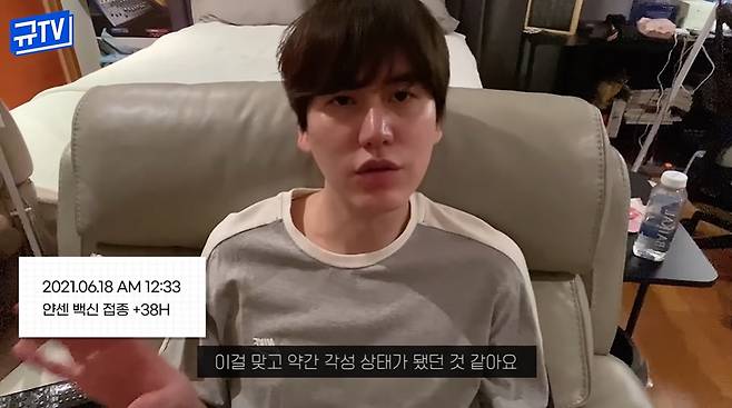 영상 속 규현은 "백신을 10시에 맞았다. 접종하고 거의 6시간 정도 흘렀다. 현재 상태는 팔이 조금 욱신거린다. 목이 잠긴 건 잠을 자서 그렇다. 아직까지는 큰 이상 없다"고 인사했다.
