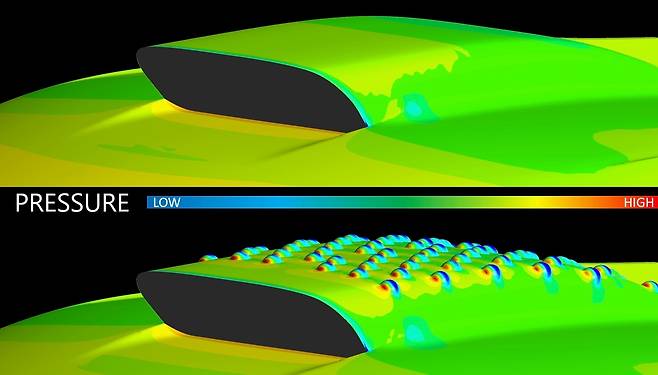 볼리드를 만드는 엔지니어들은 골프공에서 공기역학적 힌트를 얻었다. 골프공 표면에는 공이 더 멀리 날아갈 수 있도록 동그랗게 파놓은 ‘딤플’이 있다. 홈이 없는 매끈한 공은 공기를 가르고 지나간 자리가 진공 상태가 되면서 저항(Drag)을 만든다. 반면, 350~400개의 홈을 파 놓은 공은 공기가 딤플 주변에서 작은 회오리를 일으켜 공기저항을 분산한다.