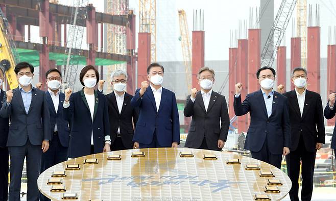 | 삼성 평택공장 찾은 文 문재인 대통령이 13일 경기 평택시 삼성전자 평택단지 3라인 건설현장에서 열린 ‘K-반도체 전략보고대회’에서 이재명 경기도지사(문 대통령 오른쪽) 등 참석자들과 함께 기념촬영을 하고 있다. 평택=청와대사진기자단 |