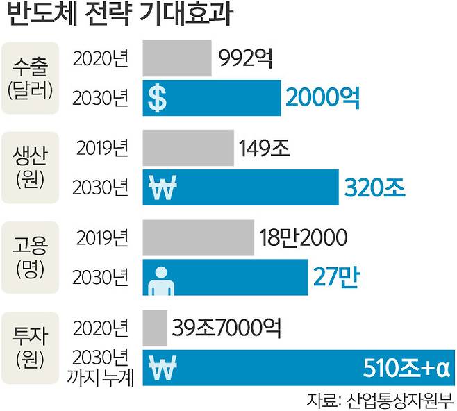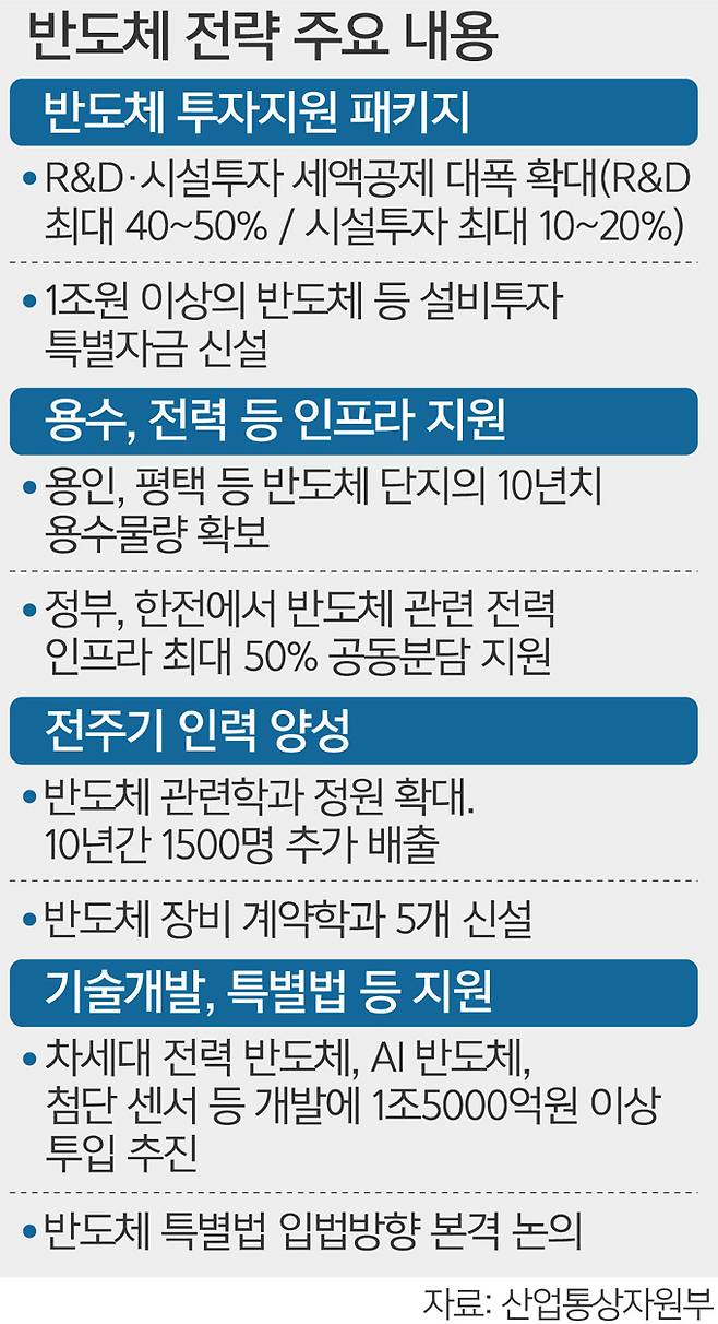 삼성전자, SK하이닉스 등 반도체 기업들은 2030년까지 연구개발(R&D)과 생산 확대 등을 위해 510조원 이상을 투자하고, 정부는 세액공제와 금융지원 등을 확대한다는 방침이다. 미국과 중국 등 주요 국가들이 자국 내 반도체 기술·제조기반 확보에 총력전을 펴며 사실상 반도체를 전략 물자화하는 움직임에 적극 대응하겠다는 전략이다. 업계 일각에서는 다른 나라들에 비해 민·관 협력 투자 속도가 늦어진 만큼 과감한 규제 개선책이 필요하다는 지적이 나오고 있다.