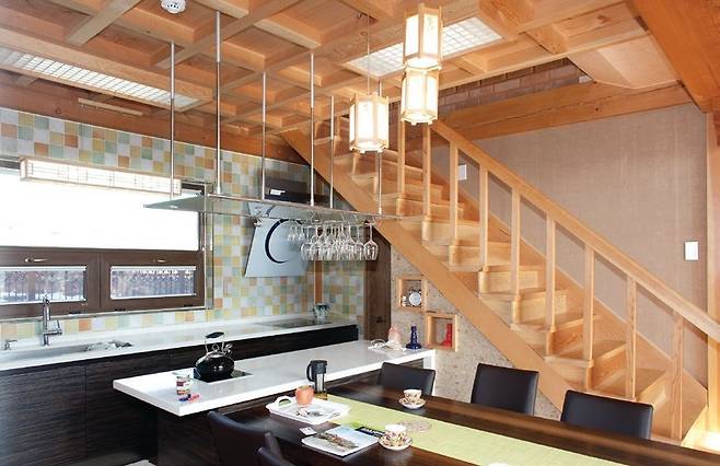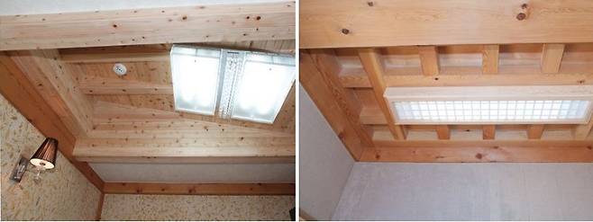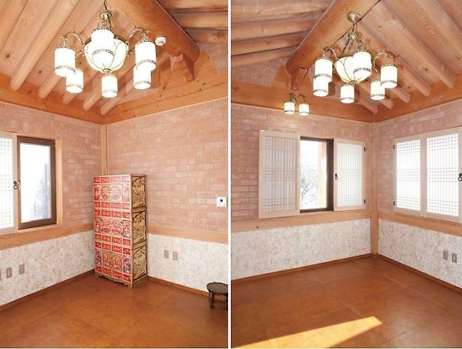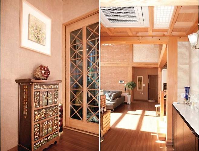 또한, 각 실의 고가 높다 보니 밋밋함을 없애고자 우측 안방은 삼량가 박공천장으로, 좌측 두 개의 방은 평천장에 원목 매립형 등 박스로 꾸민 점도 특이하다.