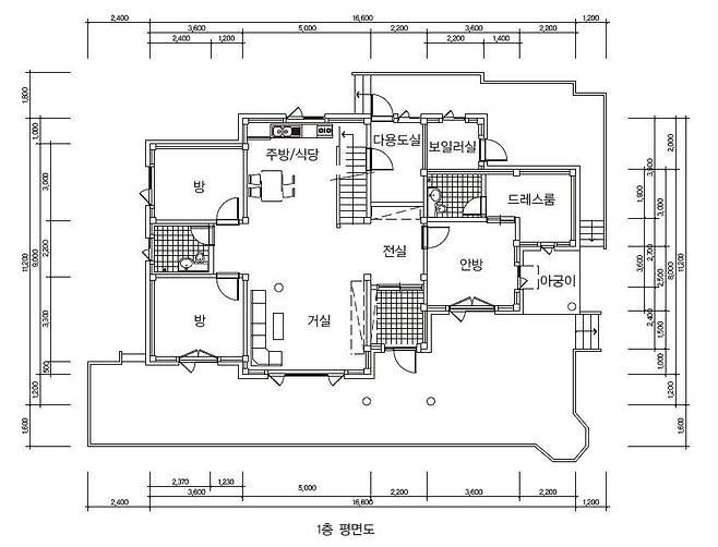 1층은 면적이 141.54㎡(44.71평)로 가운데 거실과 주방/식당을 기준으로 우측에 파우더룸과 드레스룸이 딸린 안방(구들방)을, 좌측에 공용 화장실을 사이에 두고 두 개의 방을 배치한 형태이다.