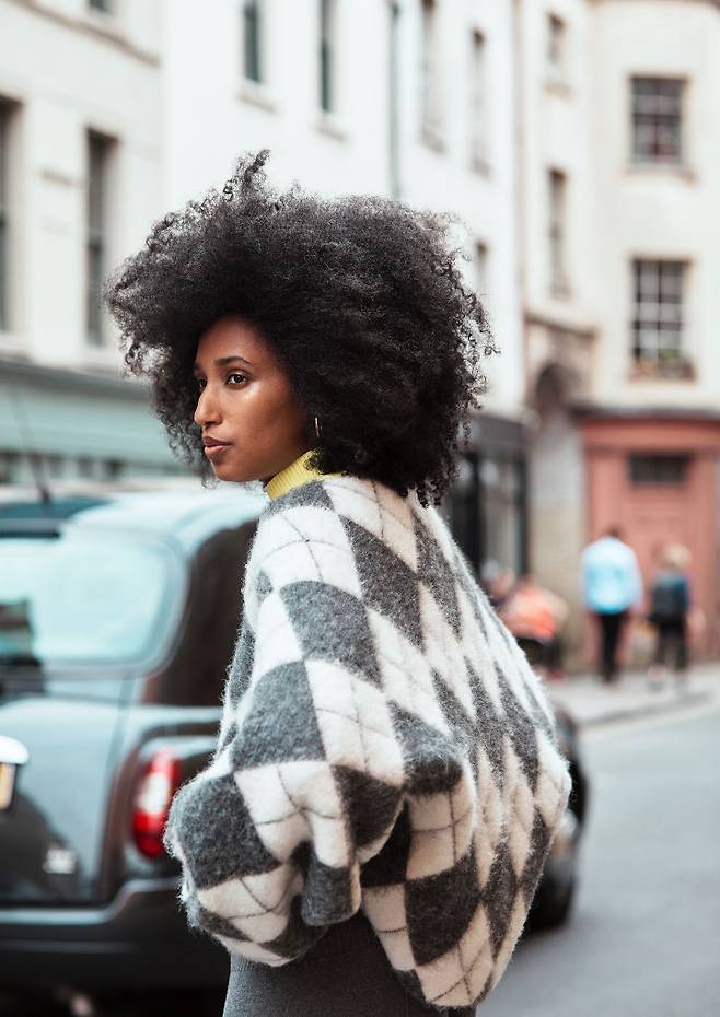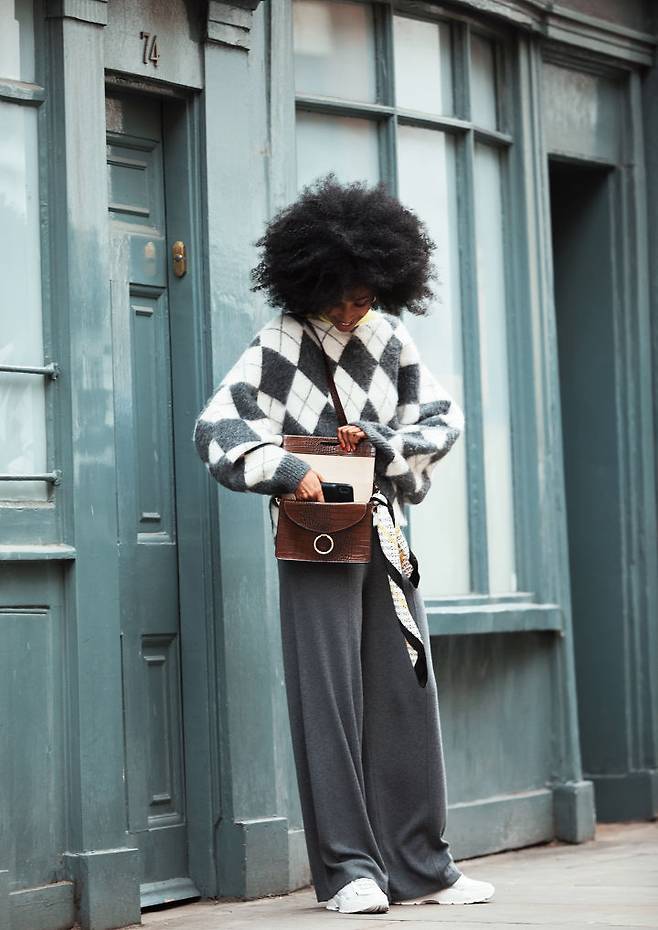 화보 속 모델 줄리아 사르 자무아는 그레이 컬러의 아가일 패턴 니트에 동일한 컬러의 와이드 팬츠를 착용해 조화로운 스트릿룩을 완성했어요.