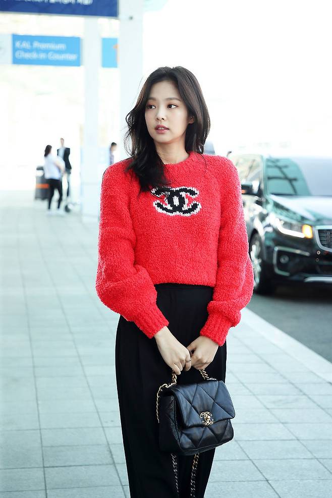 화제를 모았던 인간 샤넬 제니 공항패션인데요. 샤넬 로고가 큼직하게 장식된 레드 컬러의 사랑스러운 니트 보이시나요 ?