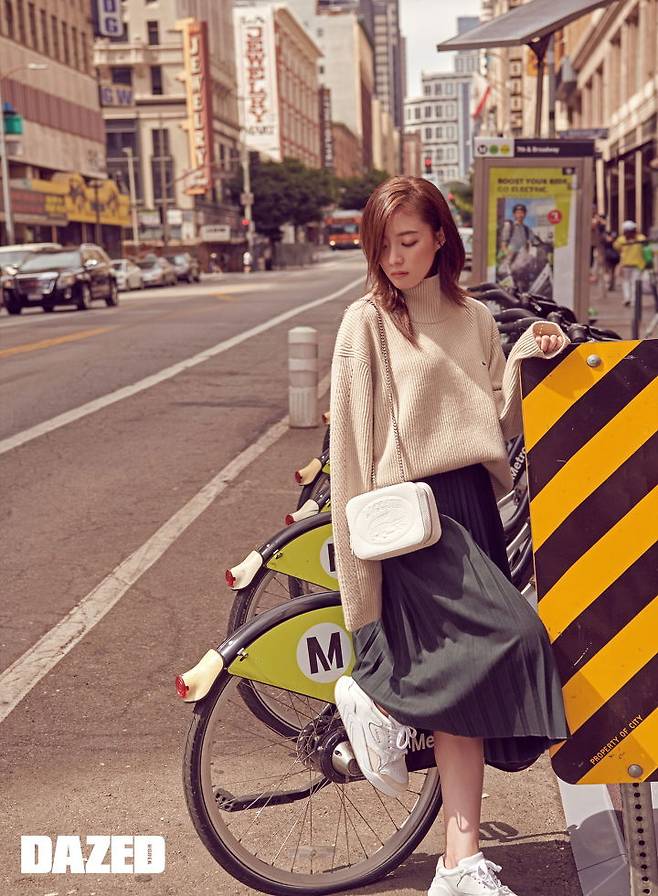 김연아는 웨어러블한 골지 니트 톱에 언밸런스 스타일의 스커트로 우아한 룩을 완성했습니다. 여기에 화이트 컬러의 미니 백을 살짝 들어 마무리했습니다.