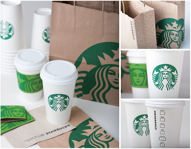 소량의 그린 컬러를 시그니처로 사용하고 나머지를 브라운 컬러로 사용해, 친환경적인 이미지와 동시에 기존 커피 색인 갈색으로 커피 전문점의 이미지도 톡톡히 챙기고 있습니다.