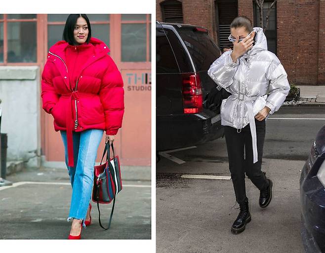 허리를 조일 수 있는 벨티드 스타일의 패딩은