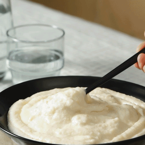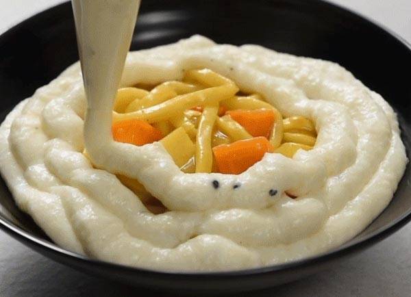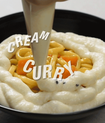 그릇에 카레우동을 담고, 감자 크림을 골고루 둘러 주세요. 보송보송 부드러운 크림 이불을 덮는 거 같아요.