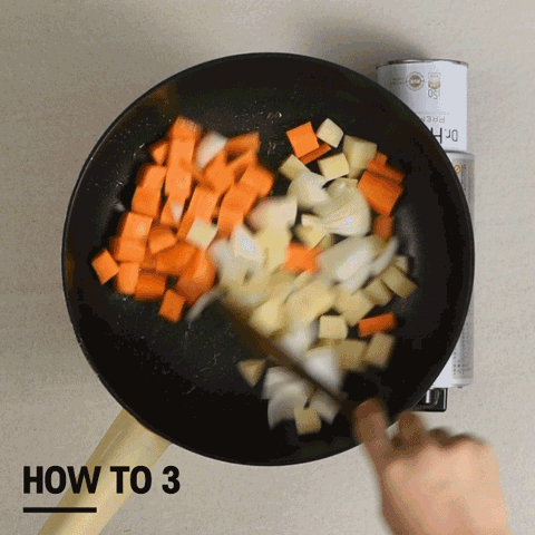 달군 팬에 썰어둔 당근, 감자, 양파와 카레 가루를 넣고 볶은 뒤 물을 붓고 끓여 주세요. 물이 끓기 시작하면 파프리카와 삶은 우동 면을 넣고 2분간 더 끓여요. 보글보글~ 카레우동 완성!