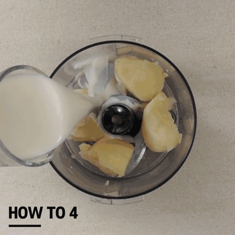 다음은 크림을 만들어 볼게요. 크림의 비밀은 바로 감자! 감자는 껍질을 벗기고 삶은 뒤 우유와 생크림을 넣고 믹서에 갈아 주세요.