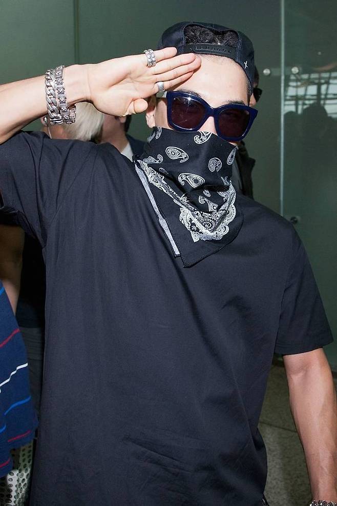2013년 말, 인천 공항에서는 마스크 대용으로 블랙 & 화이트의 반다나를 착용한 모습도 여러번 목격되었다. 그 때마마 태양은 화려한 액세서리와 거꾸로 쓴 야구 모자를 개성있는 스타일로 변주하며 미국 K-팝 팬들을 열광시켰다.