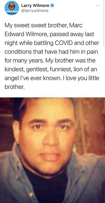 지난 1일 미국의 코미디언이자 작가, 프로듀서 래리 윌모어(Larry Wilmore)는 자신의 소셜 미디어를 통해 "사랑하고 사랑하는 나의 형제 마크 에드워드 윌모어가 코로나19, 그리고 몇 해 동안 그를 괴롭히던 다른 조건들과 싸우다가 지난밤 세상을 떠났다"고 밝혔다.