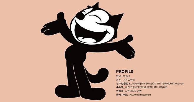 1919년 파라마운트사는 <고양이 장난(Feline Follies)>이라는 흑백 무성 애니메이션을 선보였는데, 그 주인공이 바로 눈망울이 똘망똘망한 검은 고양이였다. 당시 이름은 다소 평범한 ‘마스터 톰(Master Tom)’. 이후 세 번째 시리즈부터 행운을 뜻하는 라틴어 펠리시아스(felicias)와 고양이를 뜻하는 펠리스(felis)를 합친 펠릭스란 새로운 이름을 얻었다.