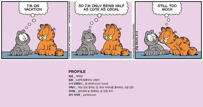 사실 가필드를 창조한 만화가 짐 데이비스가 처음 만화를 그릴 때만 해도 주인공은 고양이가 아닌 벌레였다고. 하지만 당시 인기 있는 견공 캐릭터는 많아도 고양이 캐릭터는 별로 없다는 사실에 착안해 가필드를 생각해냈다. 이후 게으르고, 라자냐를 좋아하고, 월요일을 싫어하는 이상한 고양이는 전 세계적으로 선풍적인 인기를 끌게 된다. 그 요인 중 하나는 특유의 블랙 유머.