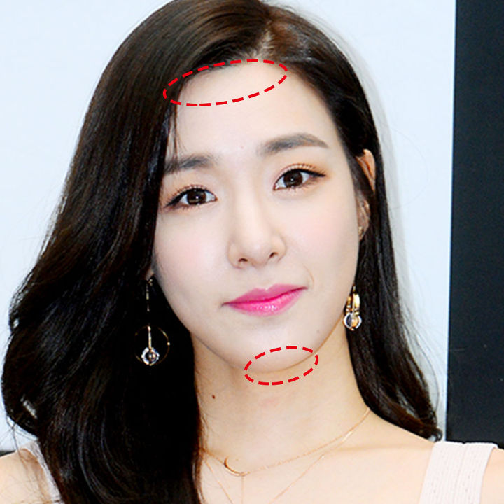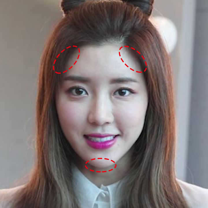 얼굴 위쪽 양옆 부분과 턱 끝!