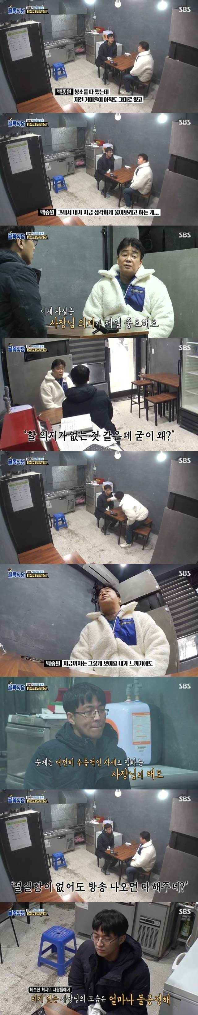 사장은 거듭 “진짜 하고 싶다”고 말했지만 백종원은 “그렇게 안 보인다. 거울 한 번 봐라. 내 눈빛하고 사장님 눈빛이 다르다. 나는 50이 넘었다. 나름대로 일가를 이뤄도 불타오른다. 난 이일이 재미있고 신난다. 방송도 음식과 관련돼 신나고 재미있다. 난 이게 너무 재미있다. 사장님은 하나도 재미없어 보인다. 눈빛이”라고 말했다.