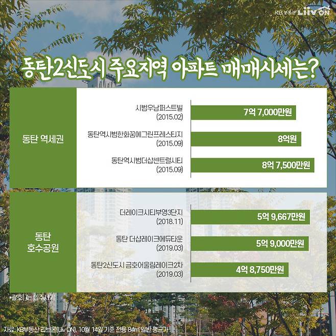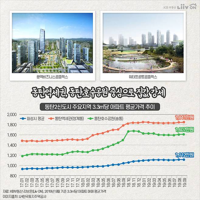 KB부동산 리브온(Liiv ON)에서 동탄2신도시 내 동별 3.3㎡당 아파트 평균 매매가격을 살펴보면 동탄역세권 인근 청계동과 오산동이 각각 1841만원, 1673만원으로 1,2위를 차지했습니다. 이어 동탄호수공원을 끼고 있는 송동이 1607만원으로 3.3㎡당 아파트 매매가격이 높았습니다.