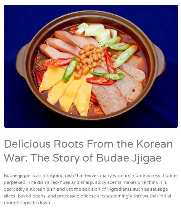 전쟁의 비극과 가난한 눈물이 고기 몇 점에 섞여 끓여진 부대찌개는 없어서 못 먹고 추워서 움츠리던 시절을 견디게 해준 따뜻한 위로였다.
