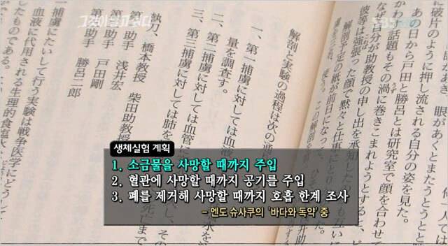 <바다와 독약>은 규슈제대에서 행해진 미군 포로를 대상으로 한 생체실험을 다루고 있다. 이 끔찍한 생체실험은 집도 책임자였던 이시야마라는 의사였는데 그는 종전 뒤에 전범으로 기소돼 취조받다가 자살해 버렸다. 그의 죽음과 함께 이 실험의 전모는 묻혀 버렸다. 이때 기소된 30여 명의 관계자는 교수형과 무기징역 등의 중형을 선고받았다고 한다.