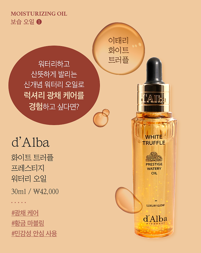 이태리 화이트 트러플과 비타민 비즈의 황금 마블링이 빚어낸 이 제품은, 굉장히 가벼운 제형을 자랑하는 제품으로 패키지에서 풍겨지는 고급진 묵직함과는 다른 매력이 있었던 제품이에요. 주륵 흐르는 워터 제형이 피부에 밀착되면 오일 제형으로 변하며 금세 흡수되는 형태인데요. 에센스로 착각할 만큼 가벼우면서도 부드럽게 발리고, 금세 흡수되어 모든 피부 타입에게 추천하고 싶은 제품이에요.