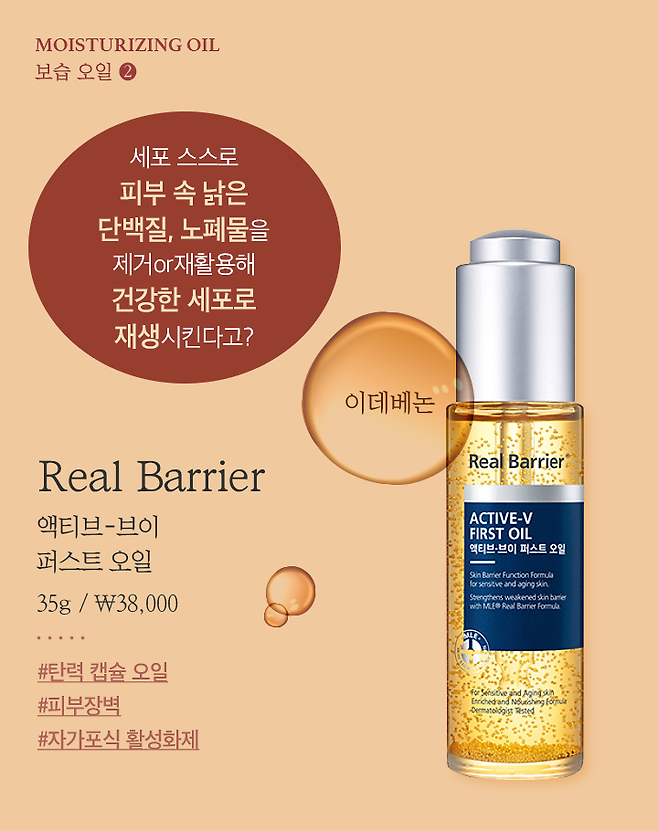 믿고 쓰는 피부 장벽 전문 브랜드 리얼베리어 제품. 강력한 항산화 성분으로 알려진 '이데베논 성분'을 캡슐에 담았는데요. 보다 효과적으로 피부 노화의 주범을 잡을 수 있다고 해요. 무엇보다 놀라운 것은 독자 기술인 '듀얼가드'성분을 함유했다는 점인데요. 세포 스스로 피부 내부의 단백질과 노폐물을 제거하거나 재활용해 피부 노화 속도를 조절할 수 있다고 하네요. 정말 놀랍지 않나요? 페이스 오일을 통해, 보습뿐만 아니라 노화의 주범까지도 잡을 수 있게 되었어요.