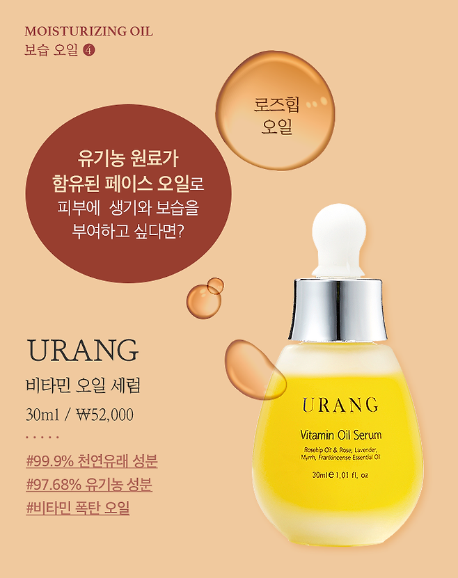 에디터가 요즘 푹 빠진 브랜드 중 하나인 유랑. 피부에 자극이 전혀 없는 순한 제품들이 많아 애용하고 있는데요. 이번에 소개해드릴 비타민 오일 세럼 역시 천연 유래 성분과 유기농 성분으로 비타민을 잔뜩 머금은 제품이에요. 외관에서부터 느껴지는 상큼함이 인상적이죠?
