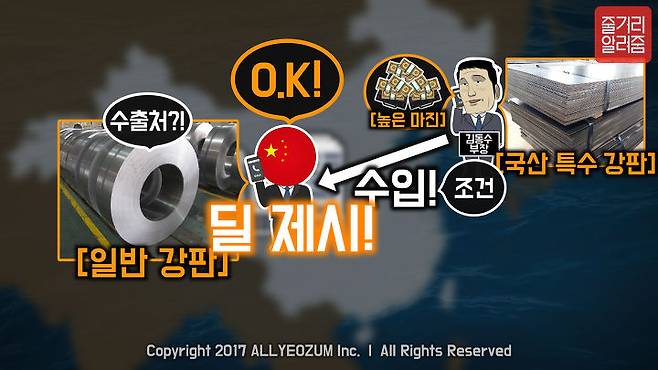 자신이 높은 마진을 챙길 수 있는 국산 ‘특수 강판’을 중국으로 수입해 가는 조건의 딜을 제시했고, 이 딜이 성사되자