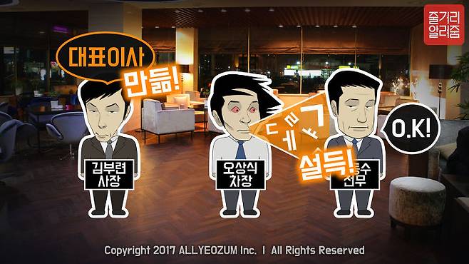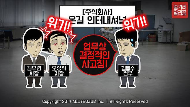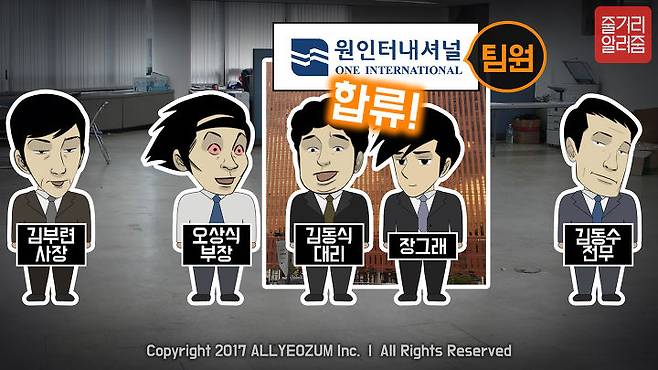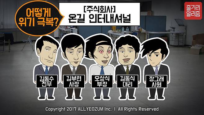 주식회사 “온길 인터내셔널”은 3명의 동업자(김부련 사장, 김동수 전무, 오상식 부장)와 3명의 직원(김동식 과장, 장그래 사원, 조아영 경리)이 근무하는 작은 회사로, 본격적인 사업을 시작하게 됩니다.