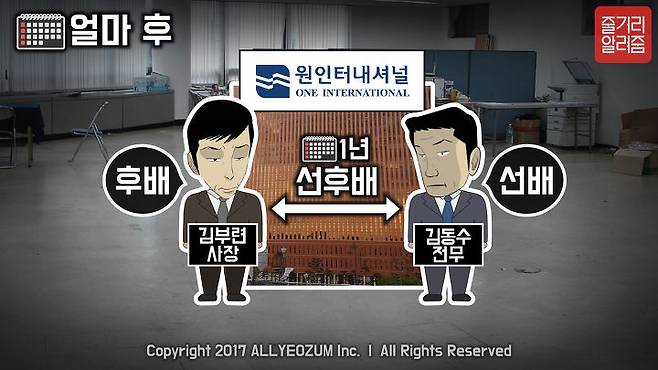 문제는, 얼마 지나지 않아, ‘원 인터’ 1년 선후배 사이인 김 대표(후배)와 김 전무(선배)의 인간관계가 업무방식 차이로 인해 점점 악화되어 가던 상황에서,