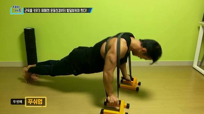 풀업 보조 밴드와 푸쉬업바를 이용해