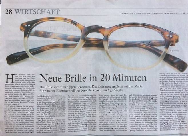 2016년 독일에서 가족 성(姓)을 내건 안경 브랜드가 주목을 받았다. 이 브랜드는 1949년 창간한 독일 대표 일간지 프랑크푸르터 알게마이네 차이퉁(FAZ·Frankfurter Allgemeine Zeitung) 지면 한 면을 장식했다. FAZ는 독일에서 영향력있는 권위지 중 하나로 쥐트도이체 차이퉁(SZ), 디 벨트(Die Welt)와 함께 독일 3대 신문으로 꼽힌다. 자체적으로 확보한 기술력과 노하우를 바탕으로 그 동안 독일에서 볼 수 없었던 합리적인 가격과 20분 안에 안경을 제작해 수령까지 하는 서비스로 눈길을 끌었다.