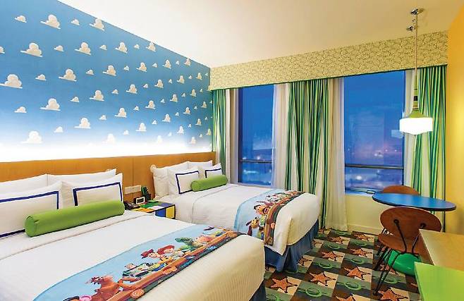 토이스토리 호텔은 애니메이션에 나온 장난감의 세계를 그대로 호텔 입구부터 객실까지 옮겨 놓은 독특한 분위기로 총 800개의 객실을 갖고 있다.