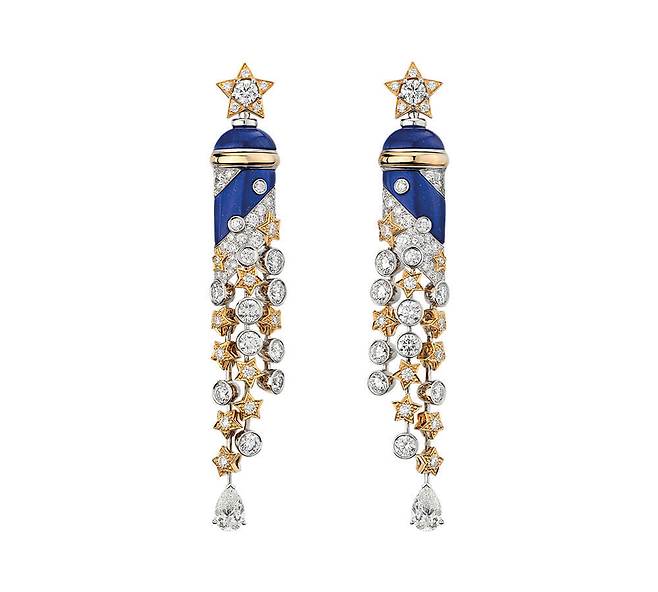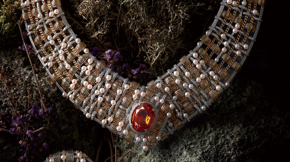 ‘물의 도시’라 부르는 베니스의 뱃놀이를 모티브로 한 그랑 카날레. 이 테마를 구성하는 총 네 가지 주얼리 세트는 일렁이는 물결처럼 부드러운 곡선 실루엣이 특징이다. 그중 운하를 떠다니는 곤돌라의 선착장 기둥에서 영감을 받아 탄생한 볼류트 베니티엔(Volute Venitienne)과 볼류트 마린(Volute Marine)은 라피스 라줄리, 다이아몬드 등을 세팅해 선명한 색감 대비를 구현했다. 마찬가지로 볼류트 크루아시에르(Volute Croisiere)에는 레드 스피넬과 다이아몬드를 번갈아 세팅하는 방식을 통해 대각선 스트라이프 패턴을 입힌 것 같은 디자인으로 또 다른 색상의 선착장 기둥, 정박 로프의 나선형 짜임을 형상화했다. 레드와 블랙 래커 마감 기법을 적용한 루반 카노티에(Ruban Canotier)는 매끄러운 광택을 살려 풍부한 볼륨감을 강조했는데, 뱃놀이를 즐기는 우아한 여인의 모자에 달린 리본 장식이 바람에 펄럭이는 장면을 보는 듯 생동감이 넘친다.