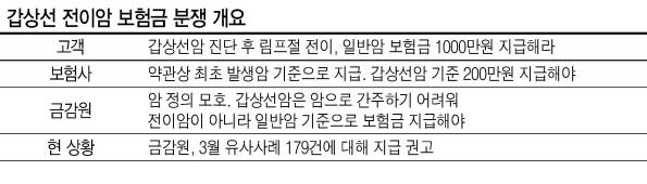 분쟁이 발생하자 금감원 금융분쟁조정위원회는 2019년 “갑상선암은 약관상 암에 포함돼 있지 않기 때문에 림프절 암을 암에서 암으로 전이됐다고 해석할 수 없다”고 결정했다.