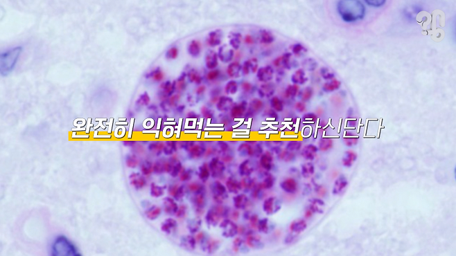 한국에서는 최근에 그게 없는 것 같아요. 걸린 사람을 한 20년 못 본것 같아요. 국내에 없는 걸로 생각이 드는데, 또 한가지는 톡소포자충이라고 그거에 걸릴 수가 있기 때문에 저는 아까 소고기는 솔직히 육회를 좀 먹는다 그랬잖아요. 근데 돼지고기는 절대 덜익힌걸 먹지 않아요.