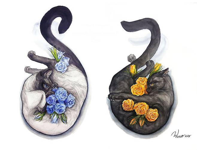 참여작가는 낭낭, 베조, 하율, 망구, 이곤, 혜진, 훅끼로 고양이를 사랑하는 작가 7인이 모여 펜화, 수채화, 펠트, 도자, 동양화 등 다양한 방식으로 풀어낸 고양이 작품을 선보이는데, 전시회 이름을 짓게 된 배경이 흥미롭다.