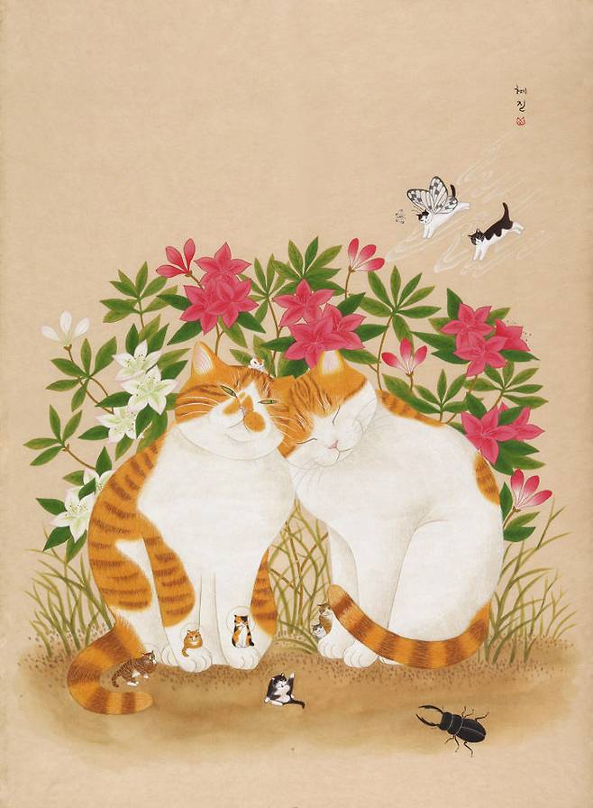△ 혜진 작가. 전통방식으로 한지를 염색해 천천히 색을 입혀 고양이 민화를 그린다. 고양이를 대상으로 작업하고, 보았을 때 어렵지 않은 그림 따뜻함을 느낄 수 있는 그림을 추구한다.