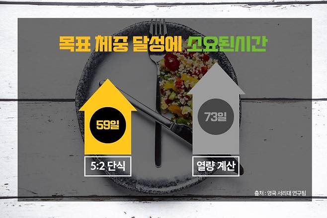 국제 학술지 '영국 영양학 저널'에서도 비슷한 연구가 발표됐어요. 과체중 51명을 두 그룹으로 나눠 5:2 단식과 열량 계산 다이어트의 효과를 비교했죠. 자신의 체중에서 5%를 감량하는 것을 목표로 했는데요. 연구팀에 따르면 5:2 다이어트가 열량 계산 다이어트보다 체중 감량 성공 시간에 도달하는 시간이 2주가량 더 짧았어요. 건강 상태 또한 5:2 다이어트를 한 그룹이 더 좋았는데요. 열량 계산 다이어트를 진행한 그룹보다 5:2 단식을 한 그룹의 혈중 중성지방 수치가 눈에 띄게 줄어들었어요.