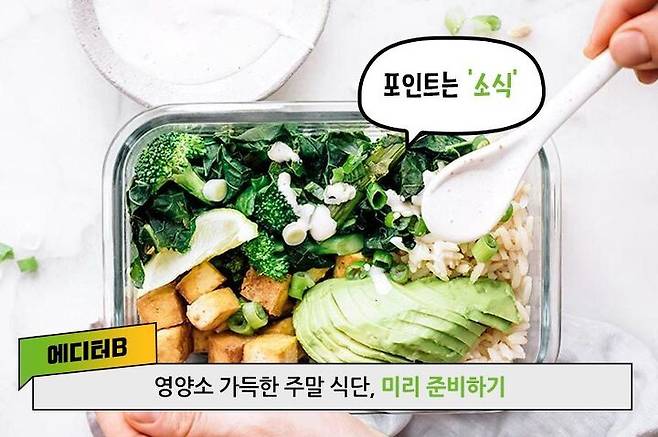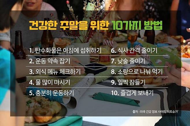 활동량이 많은 오전 시간에 탄수화물을 섭취합니다. 친구와 운동 약속을 잡아 활동량을 늘리고, 외식을 한다면 건강한 메뉴가 있는 식당을 미리 알아보는 것도 도움이 됩니다. 인간의 뇌는 목마름과 배고픔을 혼동하기도 하는데요. 외출할 때 물병을 챙기는 습관을 갖고, 물을 수시로 마셔주세요. 평일 운동이 힘들다면 주말 동안 1시간 내외의 운동을 해주는 것이 좋습니다. 출퇴근이 없다고 해서 낮술을 즐기거나 늦은 시간까지 깨어있는 건 금물이에요. 생체 리듬이 깨져 평일에 더 큰 피로감을 느낄 수 있습니다. 무엇보다 중요한 것은 '즐겁게 보내기'인데요. 충분한 휴식으로 마음의 여유를 찾고, 가볍게 산책을 나가는 것도 좋습니다.